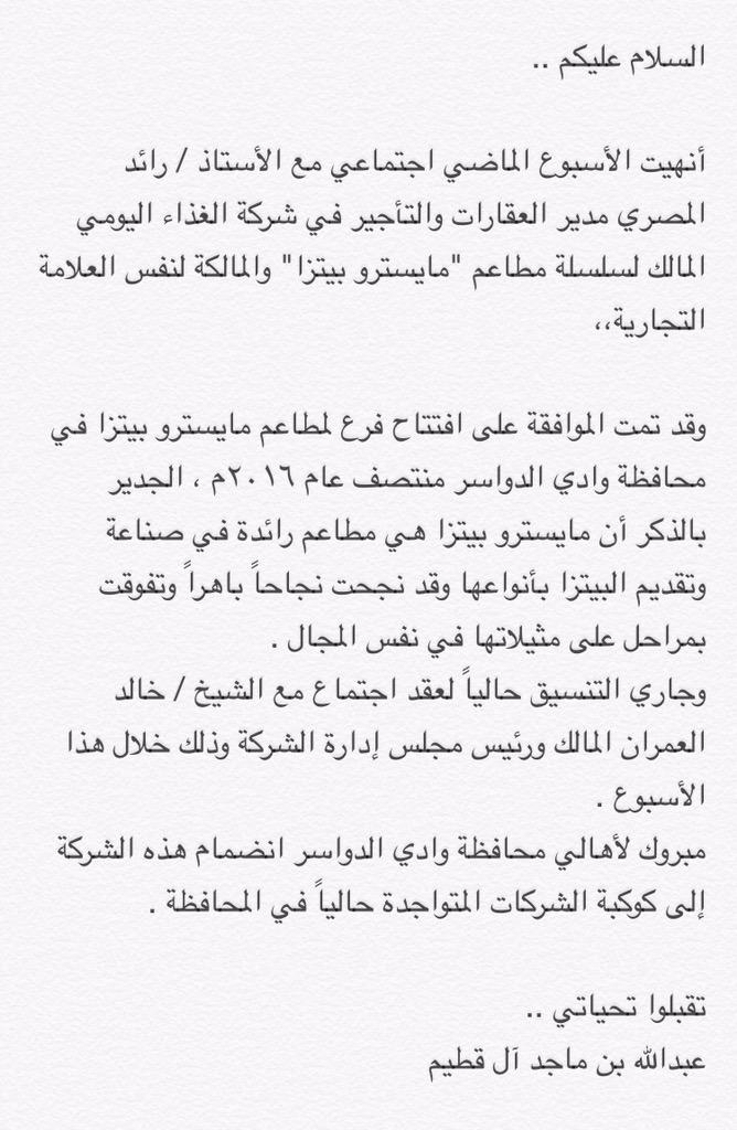 مطلوب معلم بيتزا وفطائر مكان العمل بوادي الدواسر أهم شيء يتقن العمل. له عندي راتب وسكن وحافز على التوصيل واتساب فقط. عندي مطعم في وادي الدواسر وأريد سائق للتوصيل. فرضت بلدية محافظة وادي الدواسر مساء اليوم غرامة مالية بالحد الأعلى على أحد المطاعم وذلك لوجود طفح في المجاري ووجود أكثر من 30 ألف حبة سمبوسة مجهولة المصدر غير صالحة للاستخدام ووجود أيض ا سوء التخزين وسوء النظافة.
