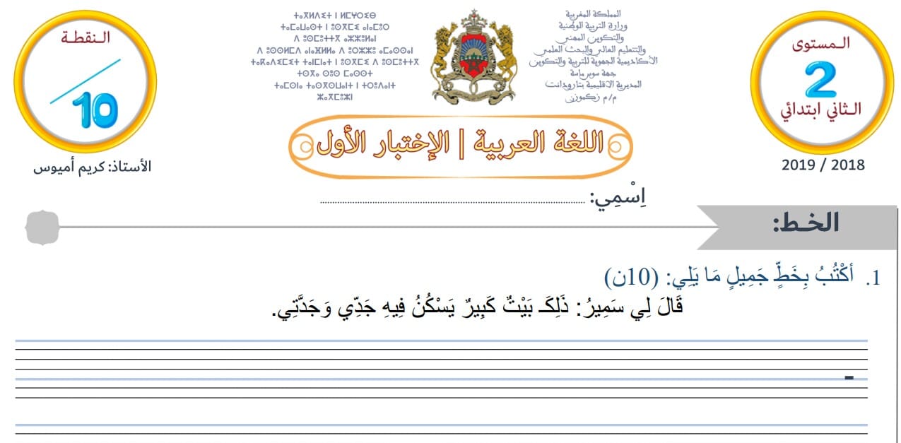 فرض المراقبة المستمرة 1 الأسدوس الأول مادة اللغة العربية للسنة الثانية ابتدائي