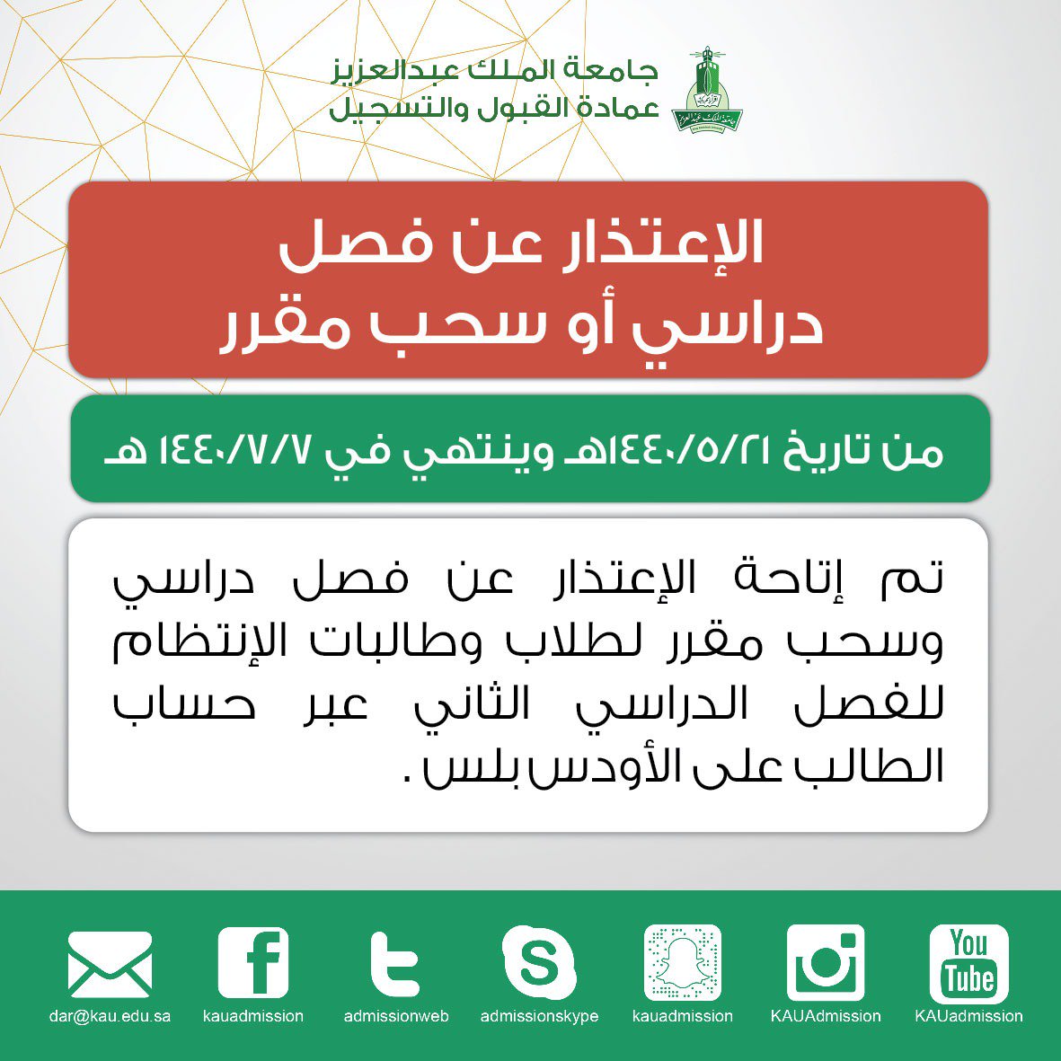 سياسة الخصوصية والنشر جامعة الملك عبدالعزيز جميع الحقوق محفوظة لجامعة الملك عبدالعزيز 2020 رابط. جميع الحقوق محفوظة لجامعة الملك عبدالعزيز عمادة تقنية المعلومات 2011.